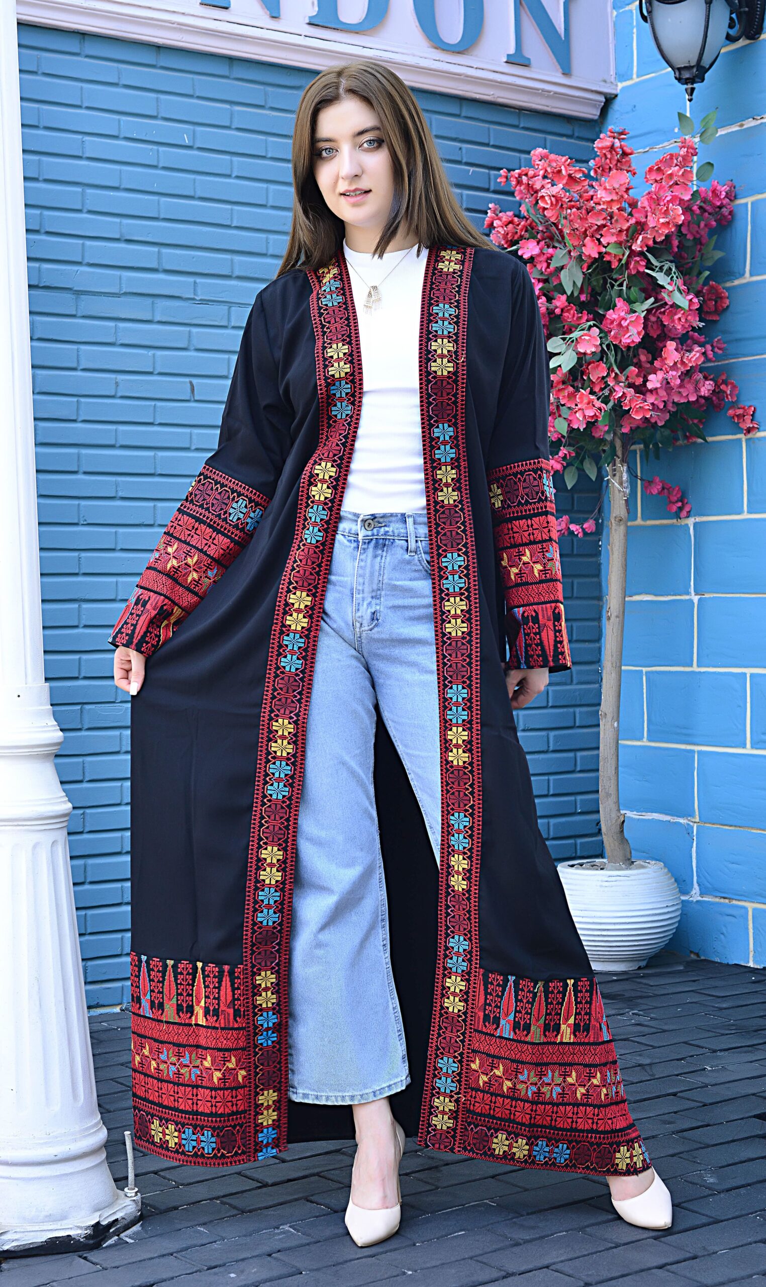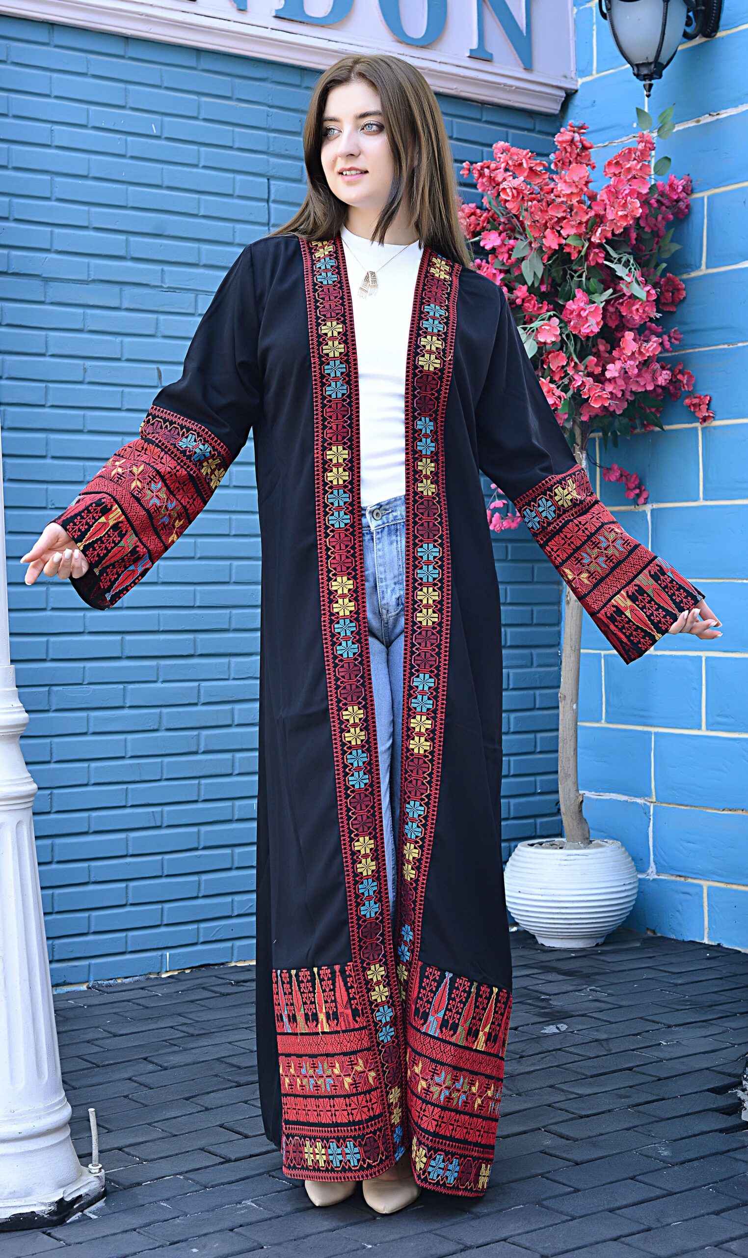 • Design: Full embroidery on the sleeves, front hem, and bottom of the abaya, making it a unique and eye-catching piece.
