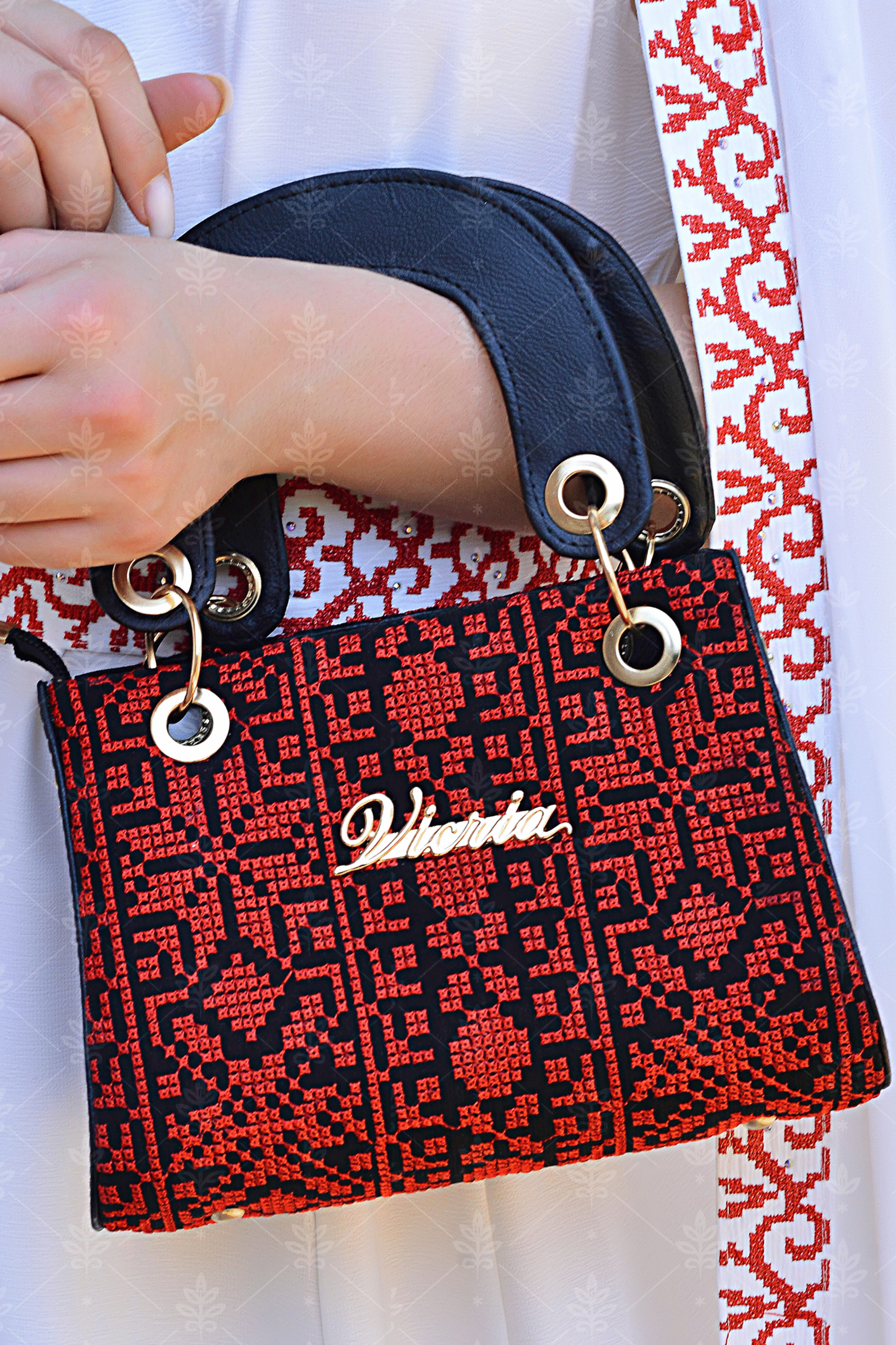 A heritage bag embroidered in red and black with an elegant design that highlights the beauty of heritage patterns.