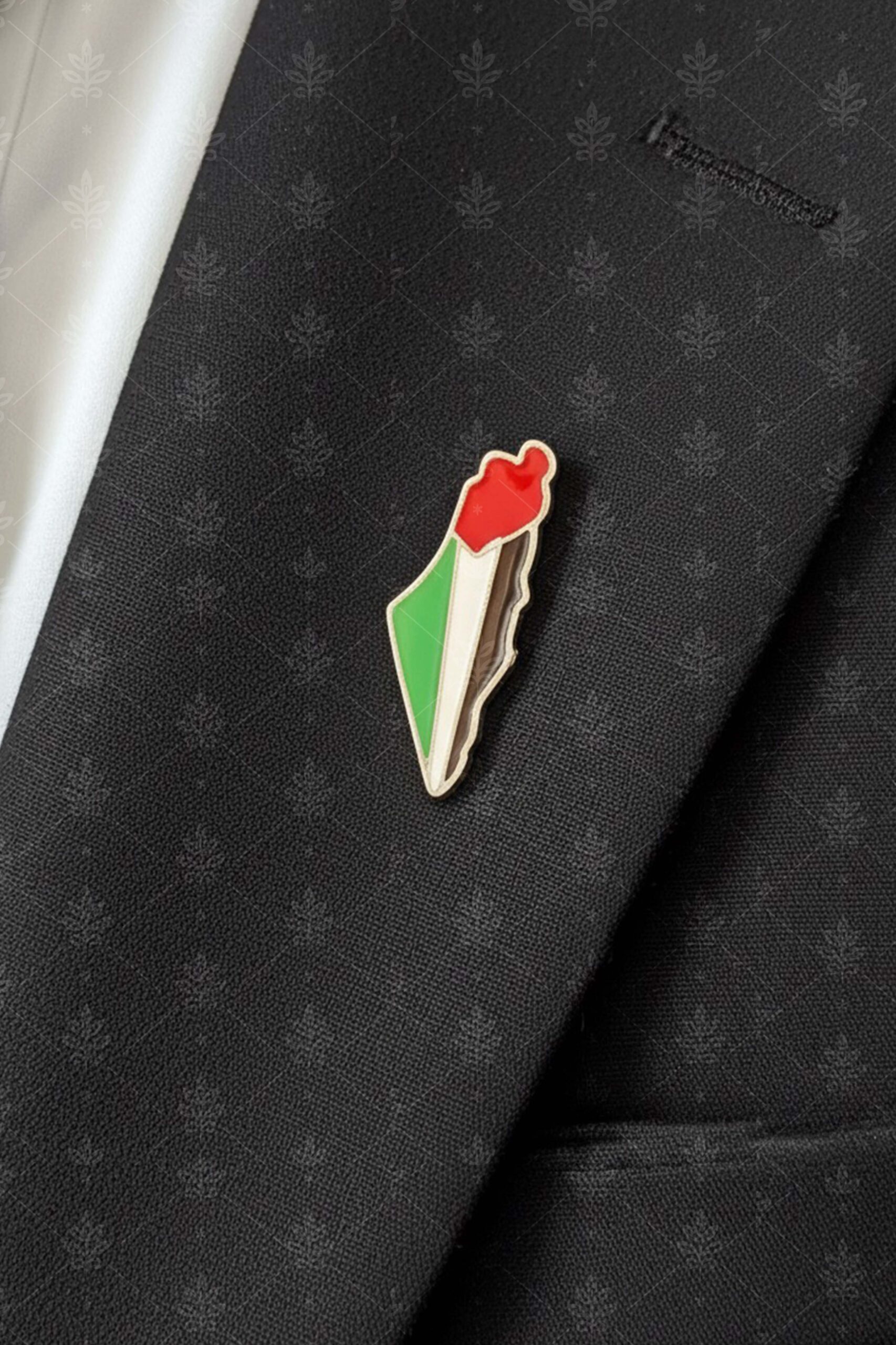 An elegant brooch in the shape of the map of Palestine, colored in the colors of the Palestinian flag, made of rust-resistant stainless steel with a full color guarantee.