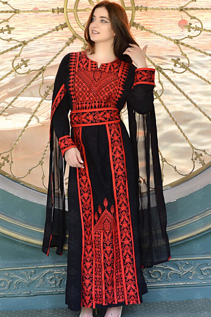 تألقي بإطلالة راقية تجمع بين الأصالة والفخامة مع هذا الثوب الأسود المطرز باللون الأحمر المميز.