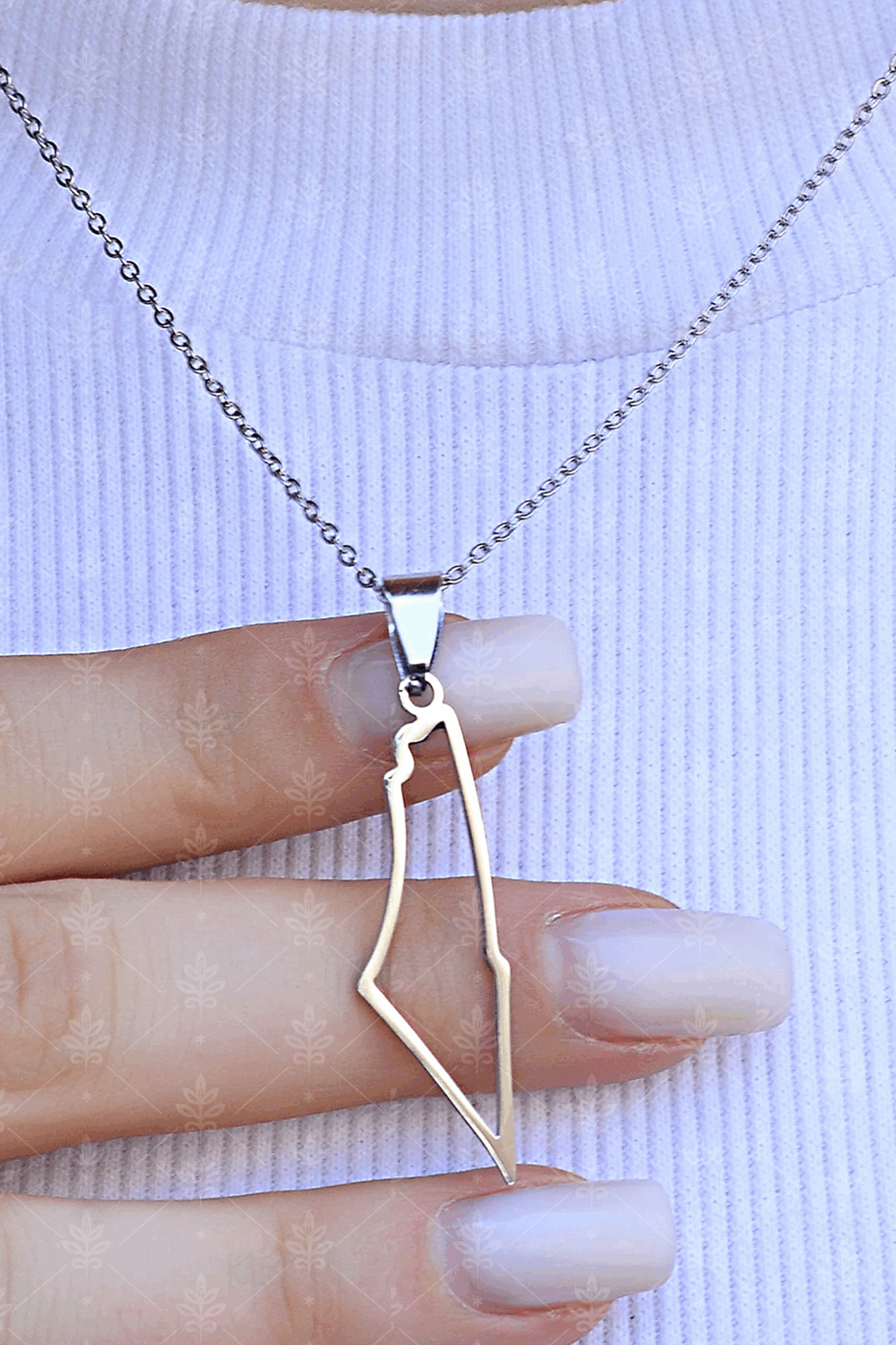 سنسال مميز مصنع من الستانلس ستيل متوفر بالذهبي والفضي، بتصميم خريطة فلسطين مفرغة يعكس البساطة والأناقة