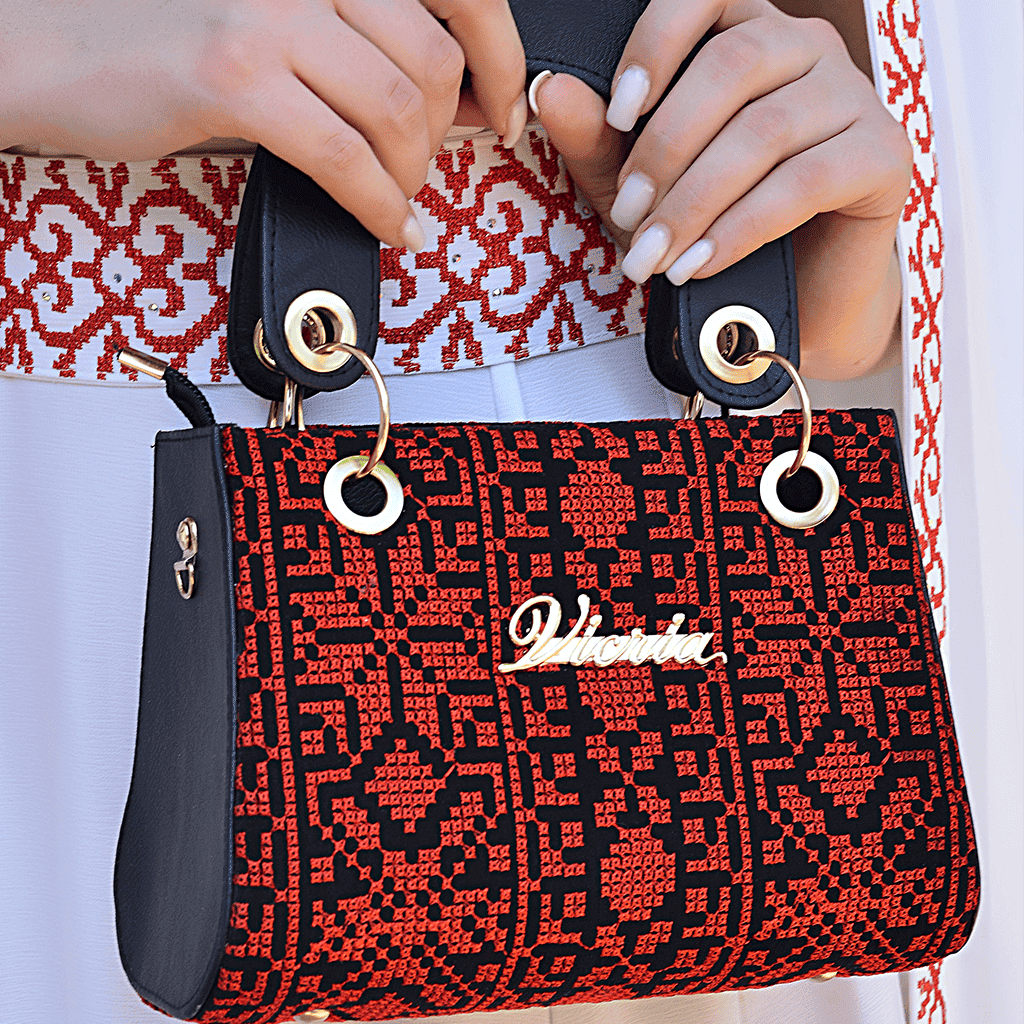 شنطة تراثية مطرزة باللونين الأحمر والأسود بتصميم أنيق يبرز جمال النقوش التراثية.